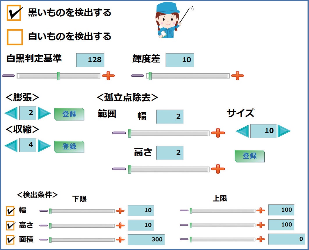 ・検査設定 プリセット登録、信号設定、照明制御、エリア指定、オーバーラップ ・画像処理 マスク、絶対二値化、平均処理、孤立点除去、膨張収縮、ラベリング ・検査画面 装置状態、検査結果、撮像モニター、NG履歴 ・検査履歴 検索、検査単位サマリー確認、検出画像(BMP)、エリア画像(BMP) ・カメラ設定 露出時間、ゲイン ・トリガー設定 トリガーモード、エンコーダーパルスモード、インターナルモード |