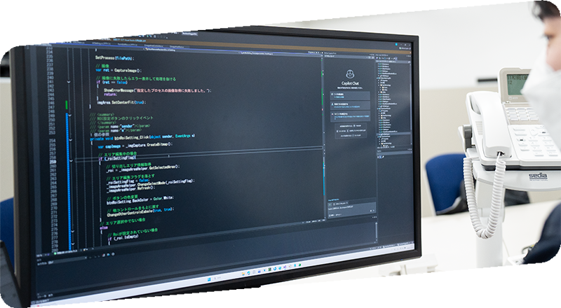 Next Technologyのシステム開発の強みは、画像処理システムの処理結果に従い次の処理を行う検査・診断・制御システムを、ワンストップで開発できるところにもあります。画像処理システムより受け取った情報をもとに、何をどう動かすかをシステムエンジニアがさまざまなご提案を行い、プログラマーとのチームで最適なシステム構築を行います。
